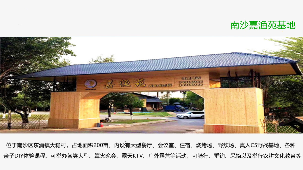 嘉漁苑拓展基地位于南沙區東涌鎮大穩村,占地面積200畝,交通便利,距離地鐵站15分鐘車程,公交直達,自駕游南沙港快速路東涌出口對面即是。基地內設有大型餐廳、會議室、住宿、燒烤場、野炊場、真人CS野戰基地、各種親子DIY體驗課程。可舉辦各類大型、篝火晚會、露天KTV、戶外露營等活動。比鄰東涌綠道和種業小鎮,可騎行、垂釣、采摘以及舉行農耕文化教育等項目。是集企業拓展、戶外團建、趣味運動會、青少年研學、親子個性化拓展、商務會議等于一體的專業化拓展基地。基地可舉辦的拓展活動多樣化、教練專業水平高、配套設施齊全。