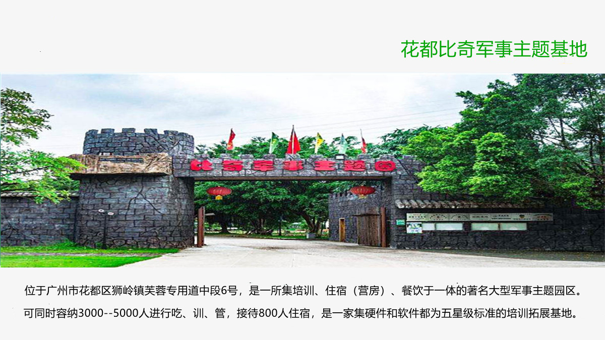 廣州比奇軍事主題園,位于廣州市花都區獅嶺鎮芙蓉專用道中段6號,是一所集培訓、住宿(營房、標三、木屋)、餐飲、游玩、休閑度假于一體的著名大型軍事主題園區。下設兩個分屬基地,一處坐落于花都風光最為瑰麗的秀全水庫北麓,坐擁龐大的生態山水之源,基地規模可同時容納3000--5000人進行吃、訓、管等,可供青少年及企事業單位進行軍事化拓展培訓,可同時接待800人住宿(標準化營房:配備空調、熱水器、風扇、獨立衛生間)及配套有山頂度假木屋。另一處坐落于省級旅游芙蓉璋度假區內,基地四面環山,風景怡人,是培訓、漂流、徒步、野外生存的首選特色主題營地,場地內各項設施、設備配套完善。是一家集硬件和軟件都為五星級標準的培訓拓展基地。
